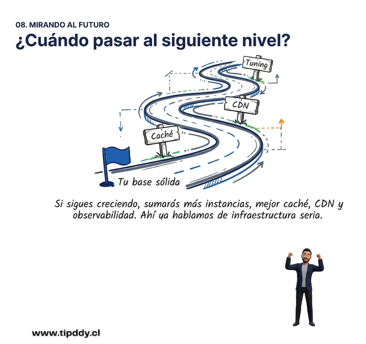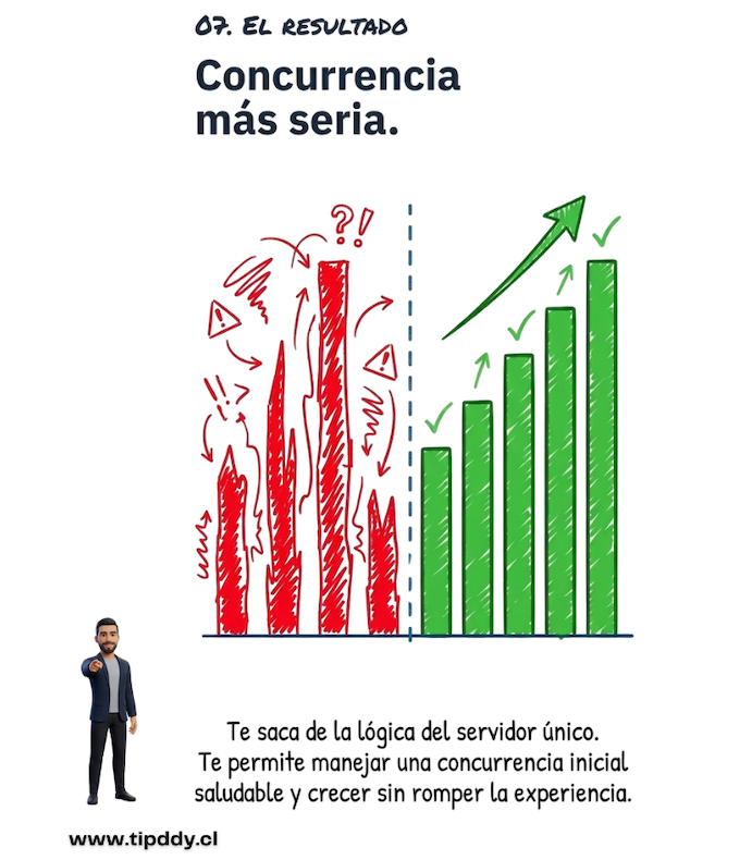 Esta configuración no busca complejidad. Busca equilibrio. Permite trabajar mejor la disponibilidad, soportar una concurrencia inicial más sana y dejar preparada la plataforma para seguir creciendo.