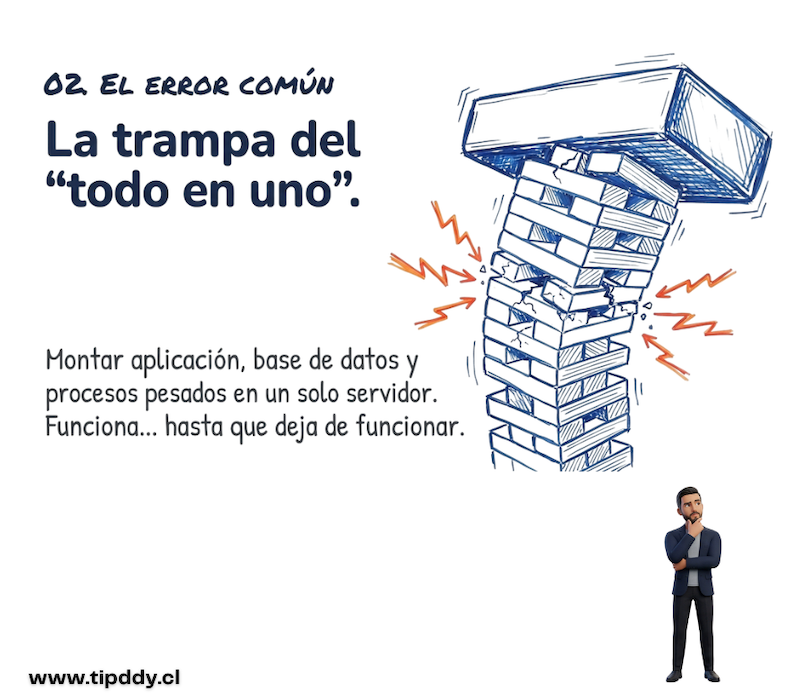 Una instalación “todo en uno” puede funcionar en etapas iniciales, pero suele convertirse en un problema cuando el uso real de la plataforma crece. Alojar aplicación, base de datos, cron, integraciones y procesos pesados en un único servidor genera una dependencia riesgosa.