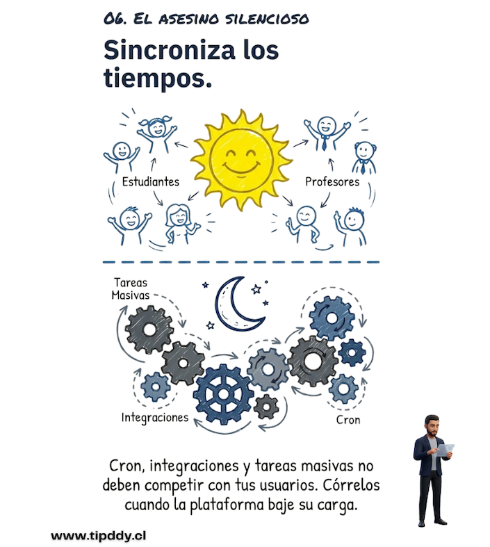 Procesos como cron, sincronizaciones, integraciones con terceros, generación de reportes o cargas masivas pueden consumir recursos valiosos justo en el peor momento. El resultado suele ser una plataforma más lenta y una experiencia deficiente para estudiantes y docentes.